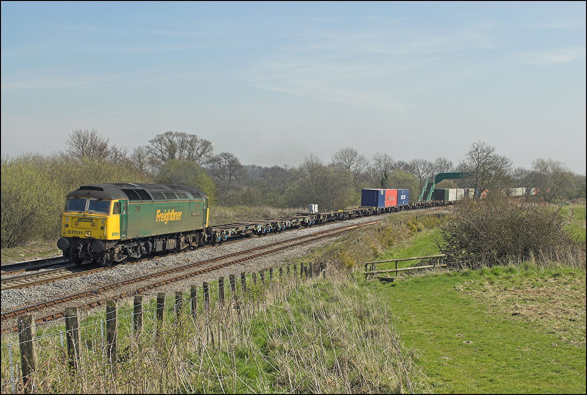 to Crewe. Here it is on the ascent of Hatton Bank running just a few minutes late in some lovely spring sunshine with fewer containers than is normal on the service, which usually runs very well loaded.
