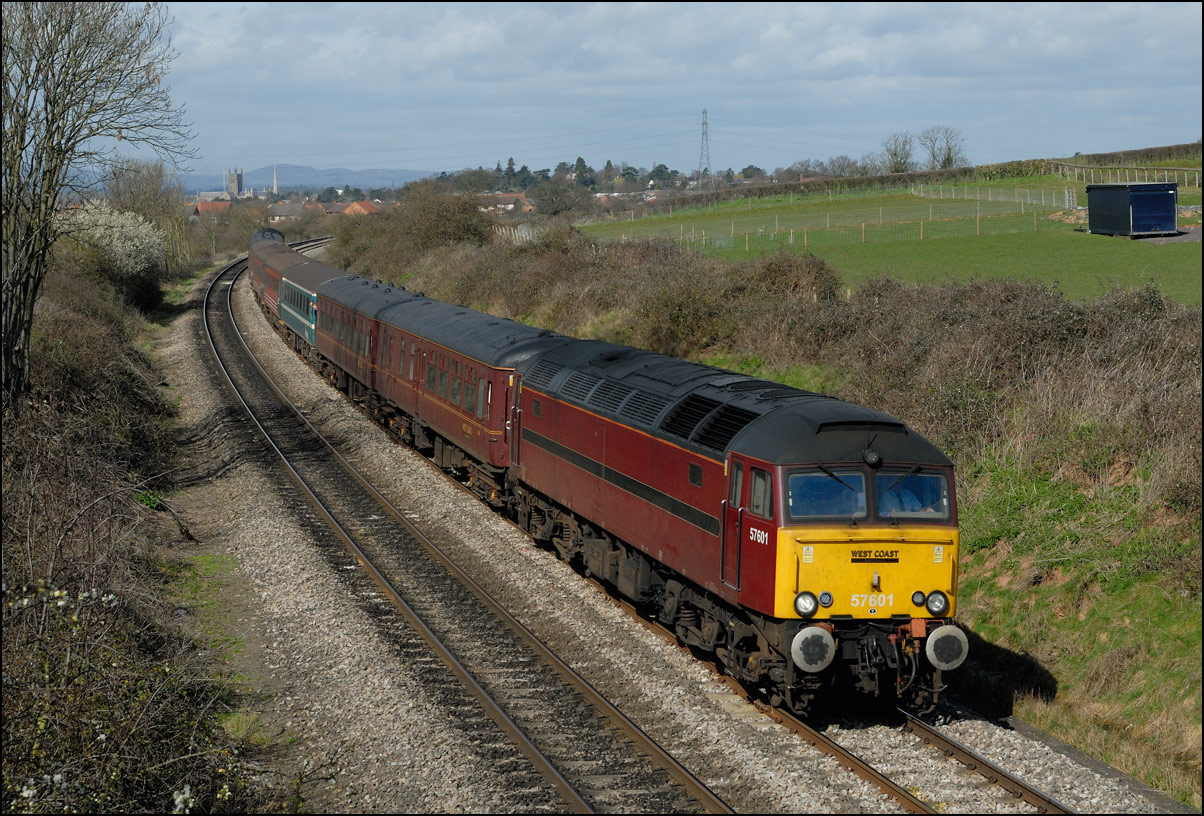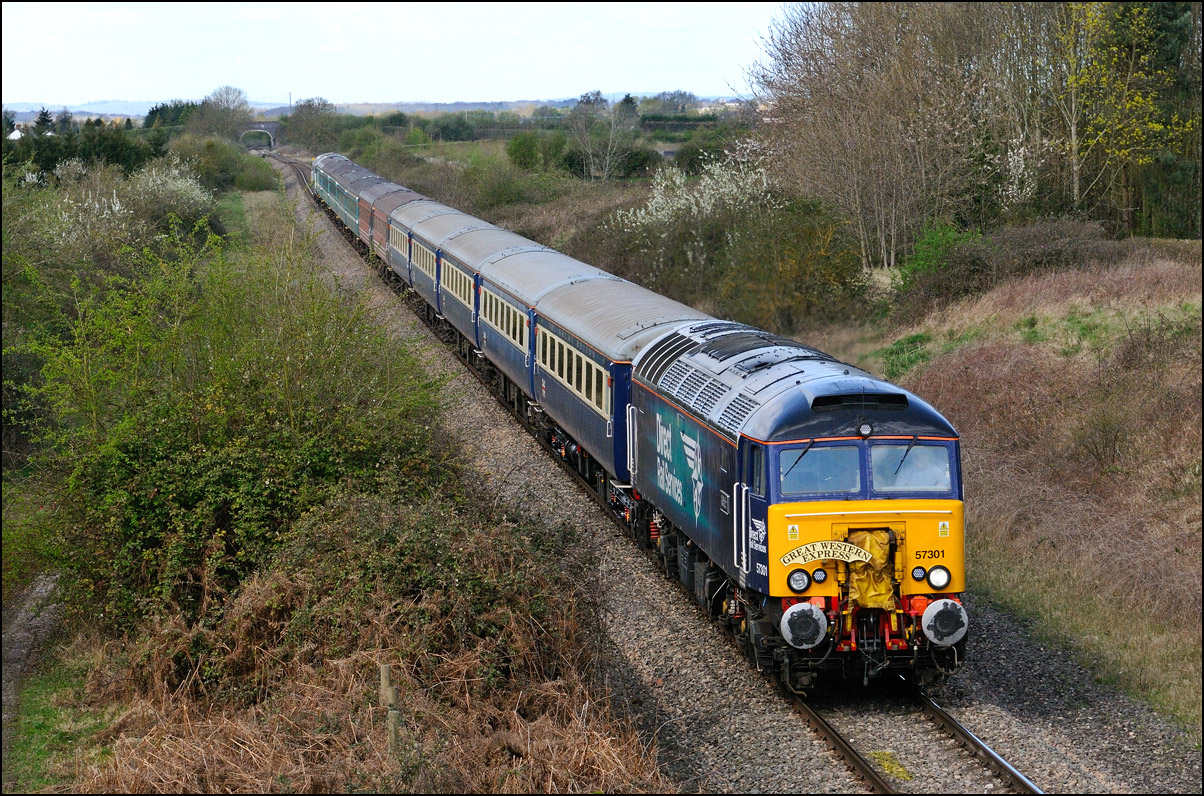 I don't usually take "going-away" pictures but did take this one of 57601 as it tailed the train through the newly blossoming blackthorn bushes along the line because class 57s are not exactly commonplace hereabouts.