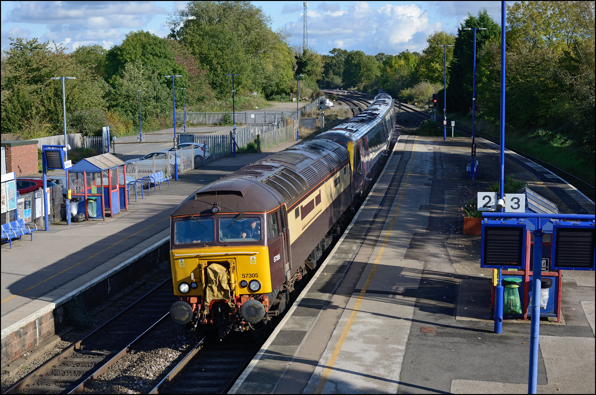 Oops... Not a great choice of location for 5M58 from Eastleigh to Central Rivers Depot on which 57305 took a CrossCounty Voyager for, presumably, repair following a failure.