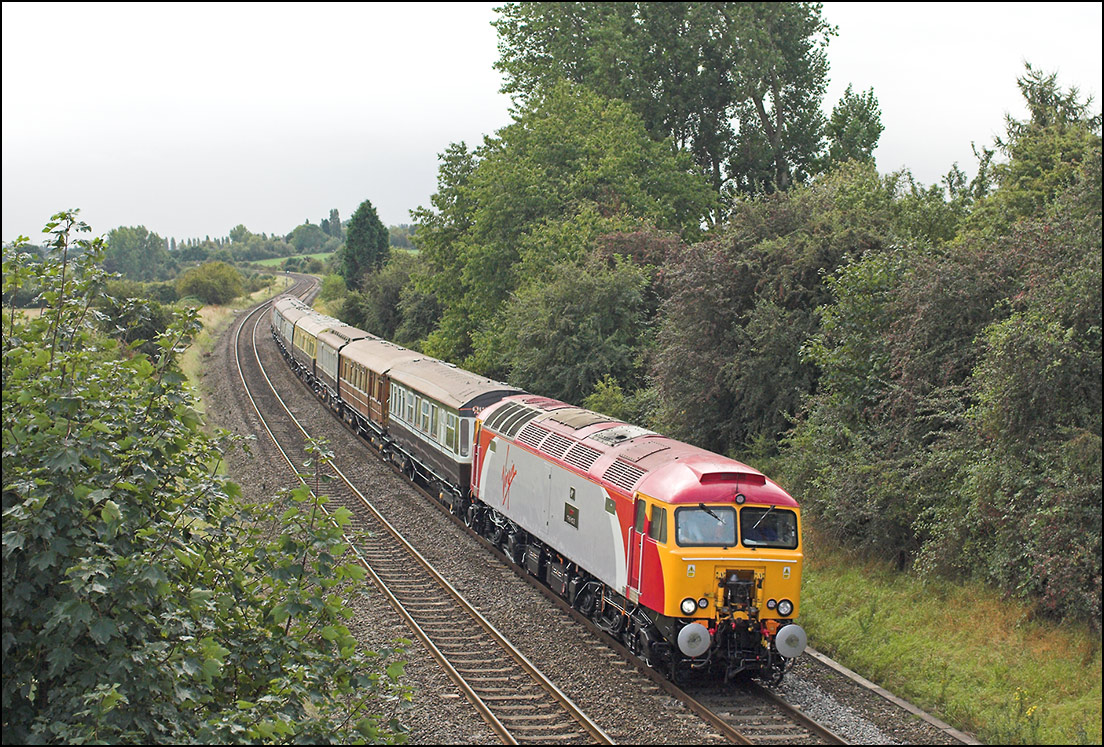 this was a jolly for some of Virgin Trains' senior management, hence the very unusual use of class 57/3 motive power. The light was dreadful but I fancied a shot because it was just so unusual so went to a bridge just south of Leamington Spa where the rather odd-looking ensemble appeared a few minutes early at 12.25.