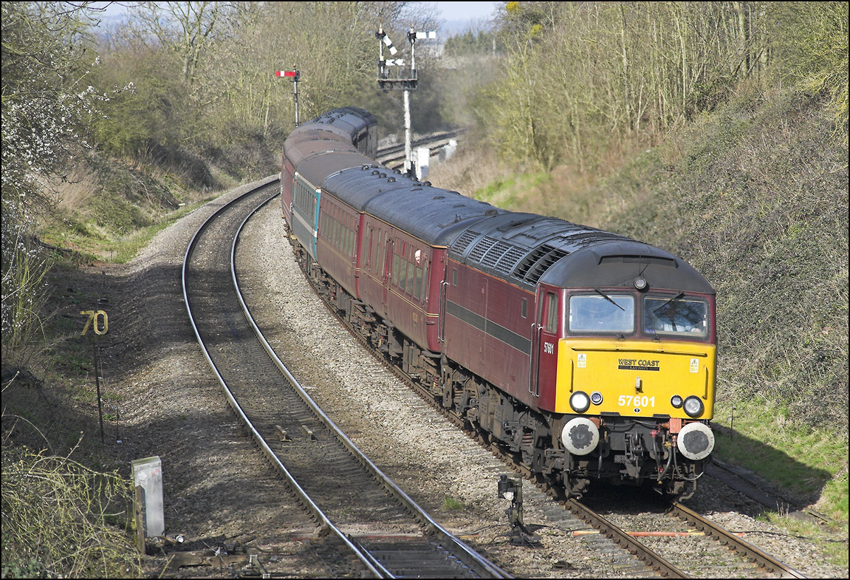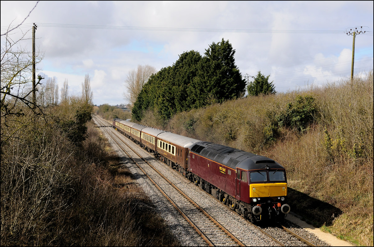 An unadvertised charter from Carnforth to Oxford was scheduled to run up the North Cotswold Line on Saturday 16 March 2013 with WCRC's 57601 + 47786 topping and tailing a short rake of six Pullman coaches. The weather earlier in the morning, when I went to Hatton to photograph