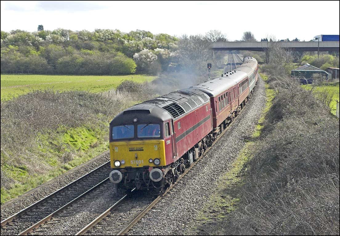 trains on the section between Worcester and Abbotswood Junction, where, apart from a few steel trains to and from Round Oak, locomotives are less common than on the main Cheltenham line. Here is 57601, just about spot on time, passing the