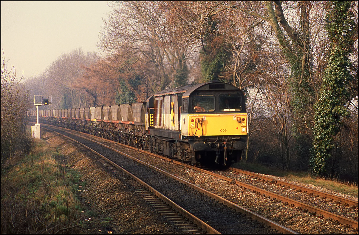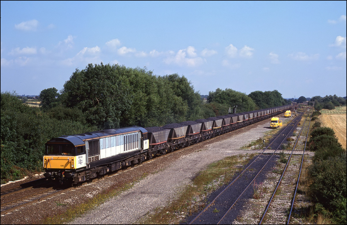 In 1994 it was rare to see anything other than a 58 on MGR traffic to Rugeley Power Station. 58009 is the subject of this study at Catholme as it awaits the right of way to turn right at Wichnor junction and head along the freight-only line to Lichfield Trent