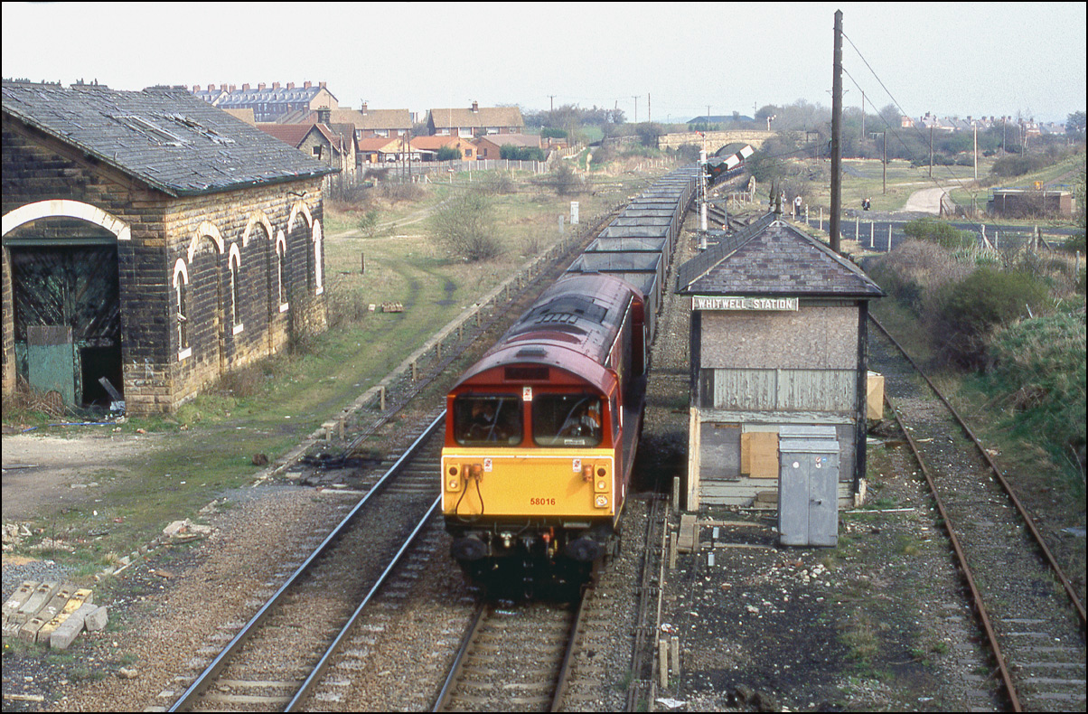 58021 arriving, probably from Nadins opencast site, and 58031 departing for Toton. By this time, the signalbox was treated as a ground frame and operated by the train crews.