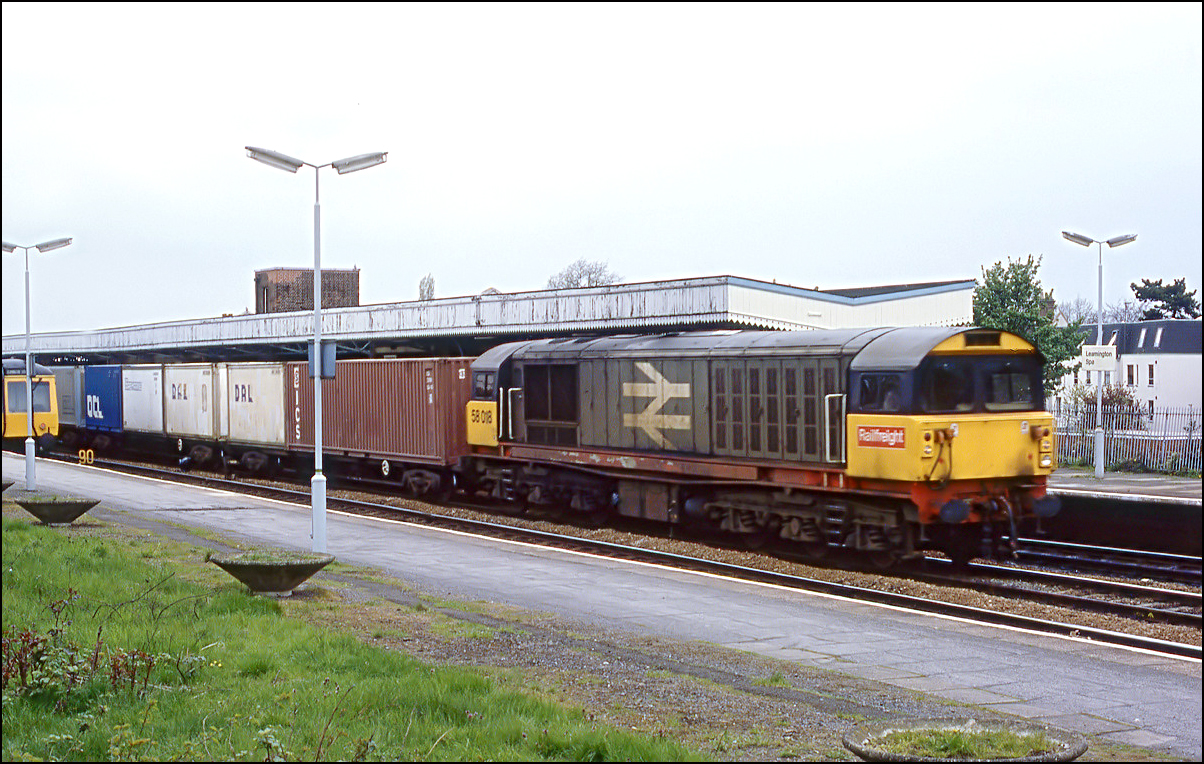 There wasn't much light at Leamington Spa on 4 May 1985 when 58018 took an up freightliner through Leamington Spa. I didn't record the shutter speed used