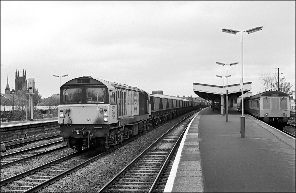 This isn't my usual sort of shot and I can't remember why I decided on a platform-side picture as 58047 came out of Ashchurch loop and ran towards the exchange sidings. Prominent in the shot is the old water tower which was for many years a bit of a landmark here but demolished