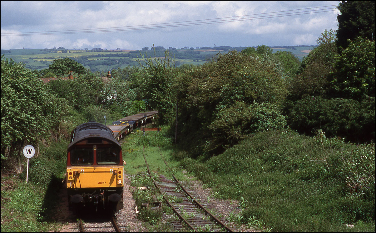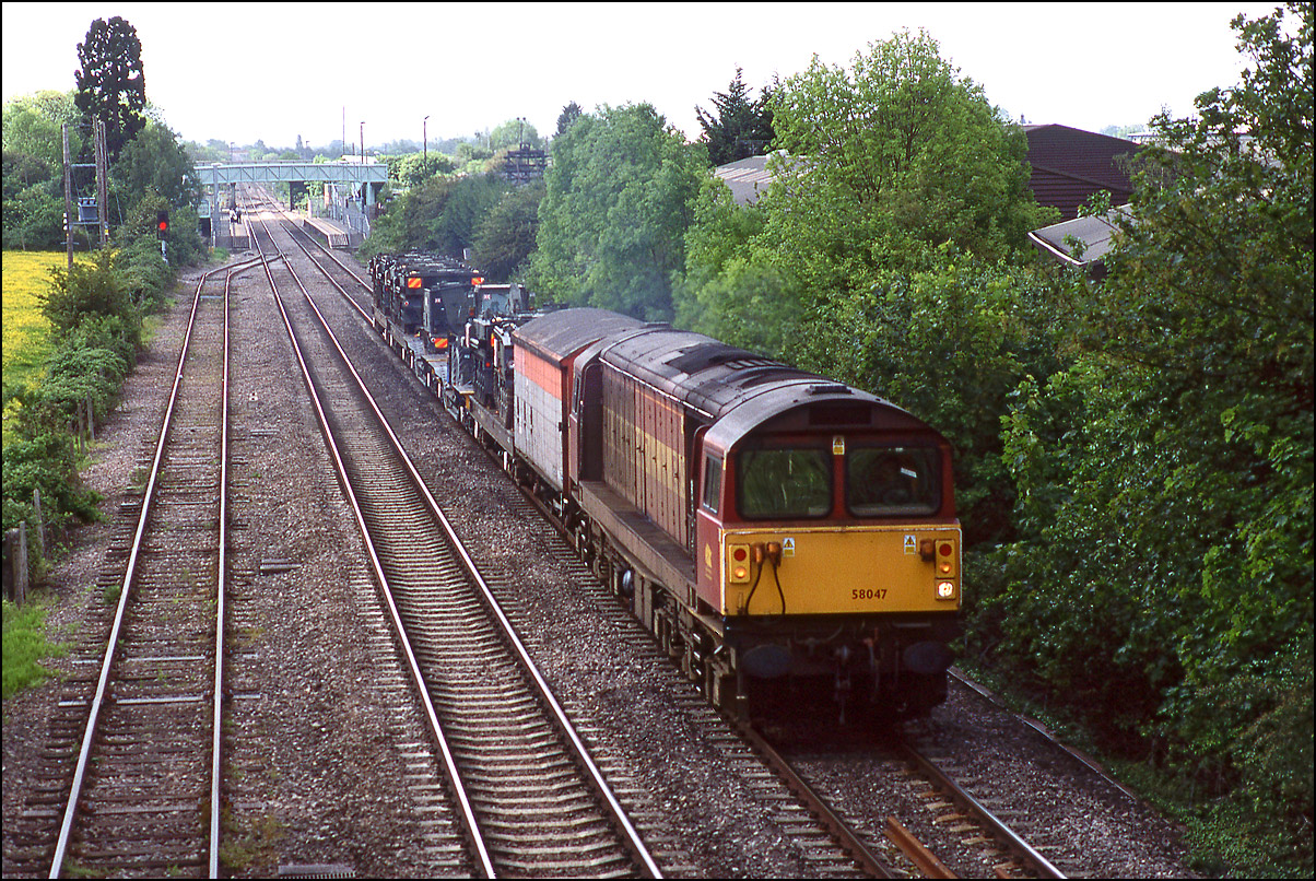 Towards the end of it's working life 58047 did some of Didcot's trip workings and on one occasion 23 May 2002, I was given a tip-off in plenty of time to drive over to Ashchurch to photograph it on the daily(ish) MOD service. The first shot shows it running north towards