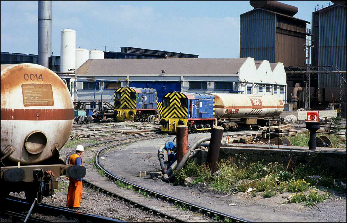Another pressure tanks was attached to the first vehicle and 08216 soon brought them both forward to make up the train ready for a main line locomotive to take out of BOC Sheerness on 16 August 1991.