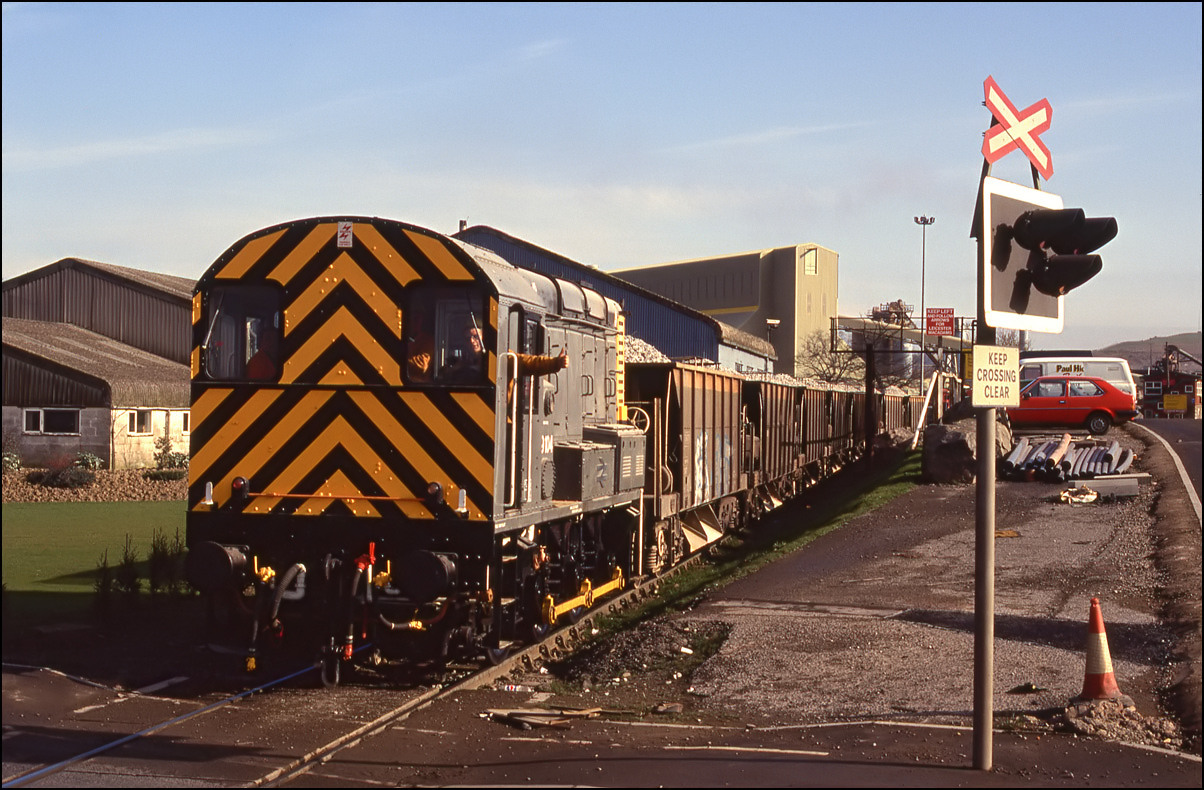 In contrast to the shot above the light couldn't have been better when 08600 came in the opposite with a long rake of bogie scrap-carrying box wagons. It's a mystery to me why I didn't take a colour transparency