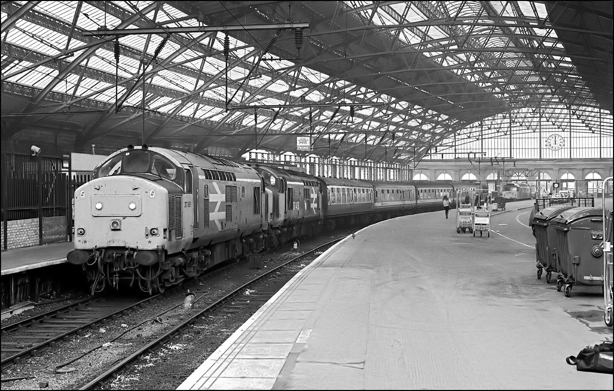 Liverpool Lime Street on 20 October 1990 with the unusual sight of 37691 + 37408 forming the 09.40 to Cardiff Central. The occasion was a Network North-West day during
