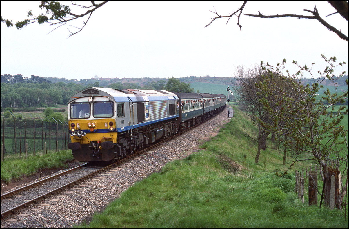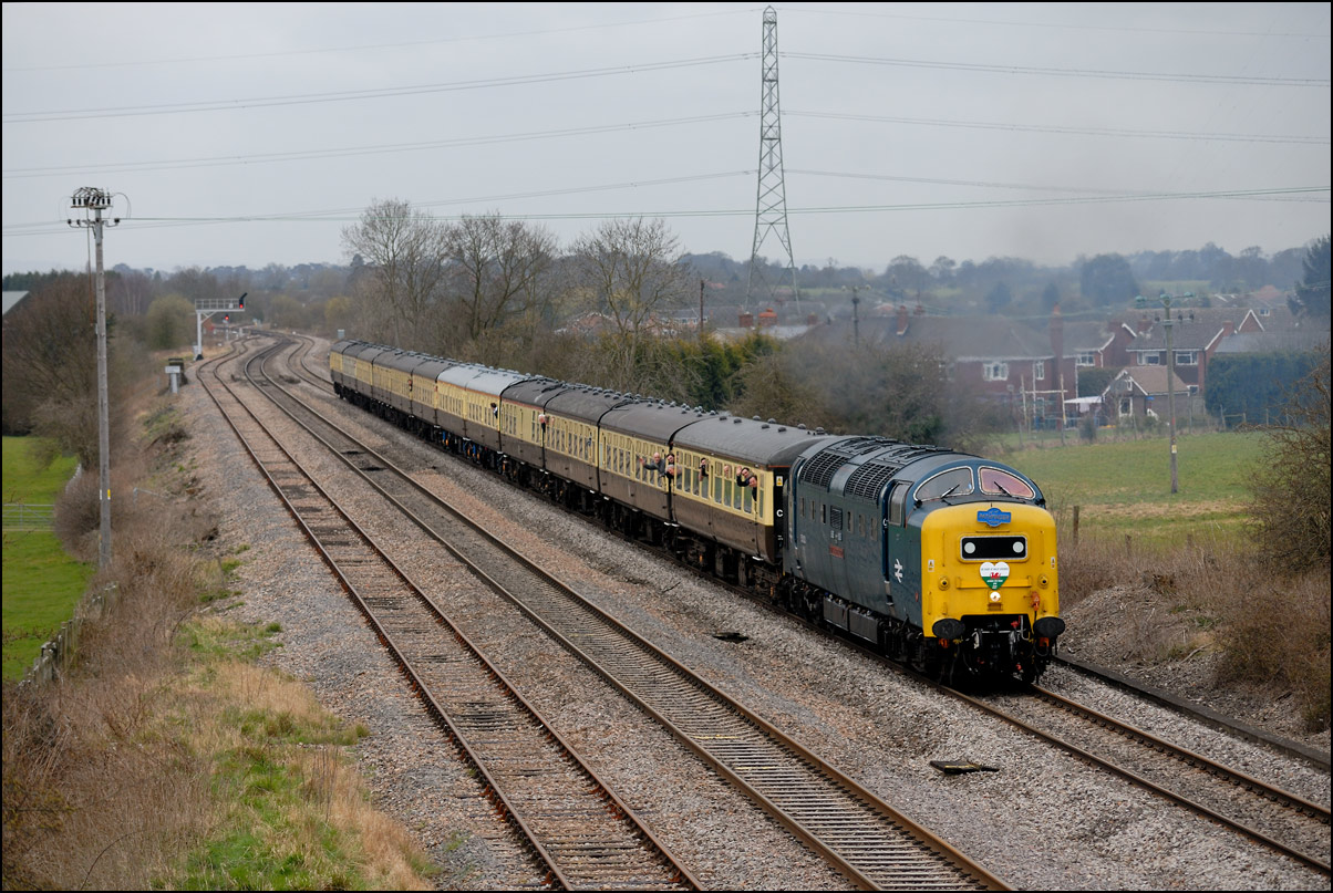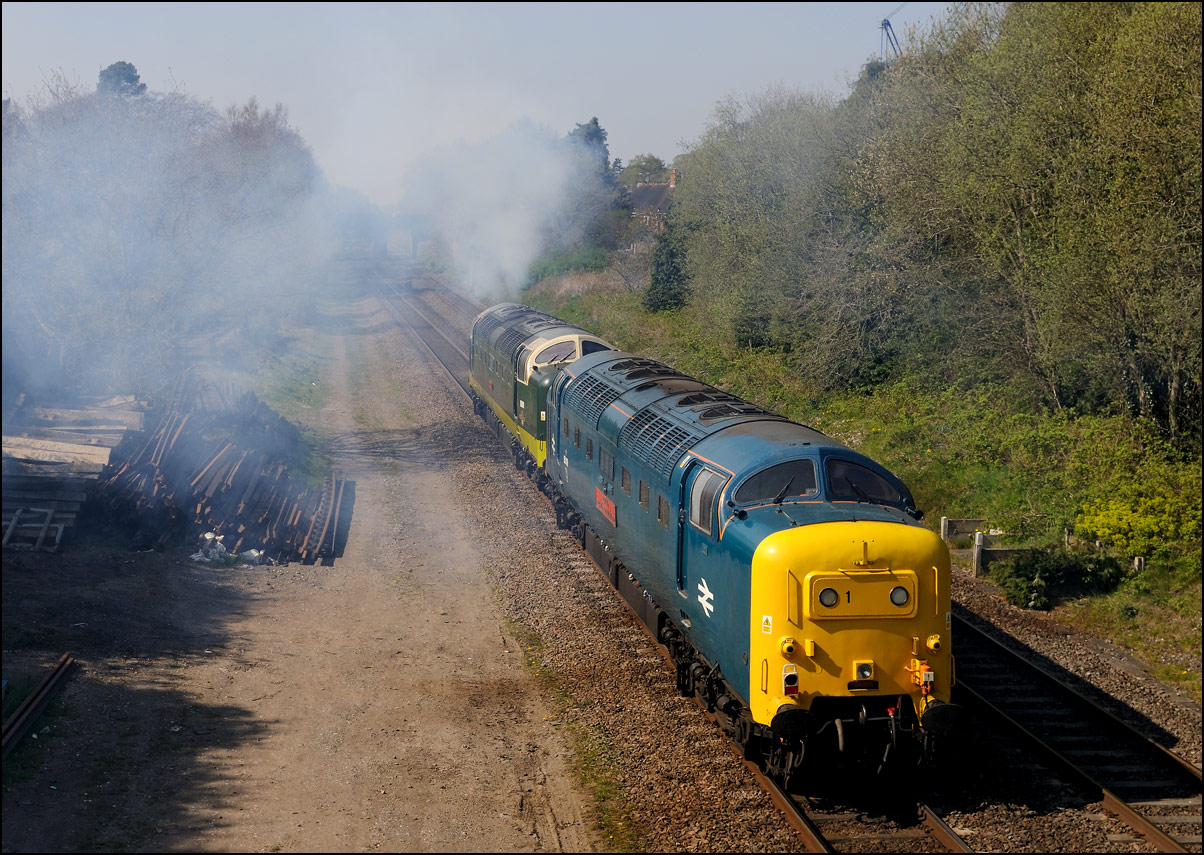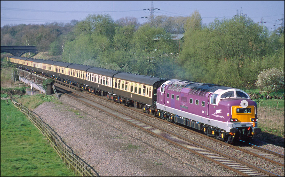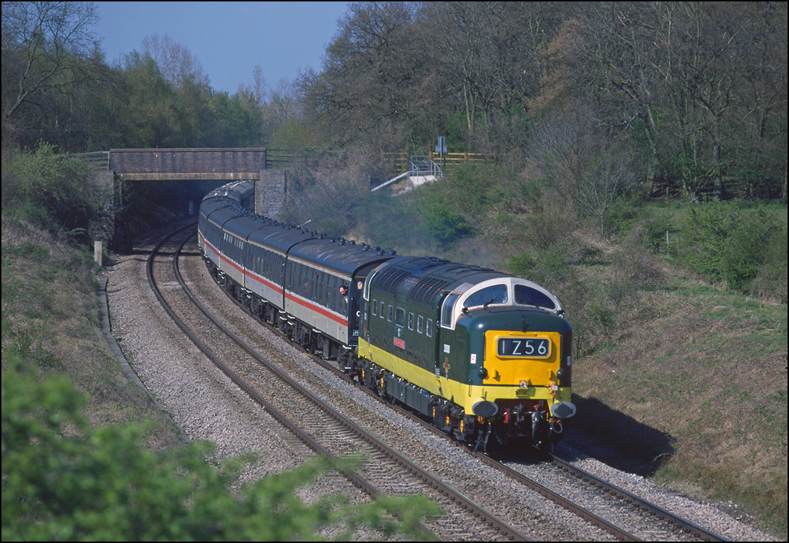 Here is a much earlier shot of a Deltic, in fact it was the first mainline run of a class member in the preservation era. 55001 is seen some 9 minutes late leaving the wood at Croome Perry on 18 April 1997 with 1Z56, the 11.30 London Euston to London Paddington via Birmingham and Bristol Temple Meads. I have never seen so many photographers