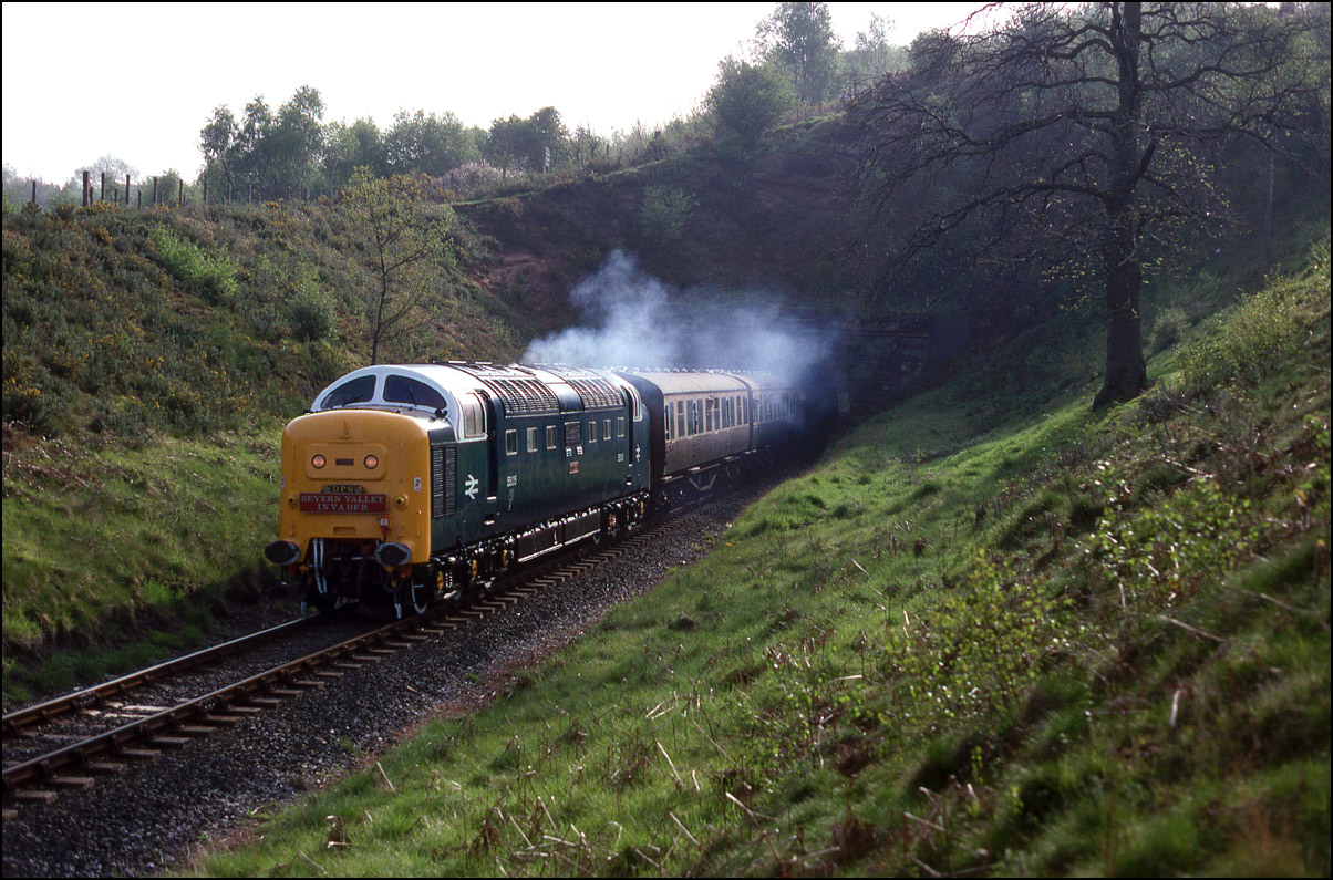 Once 55015 had reached Bridgnorth on the SVR's diesel gala day, 7 May 1988, it ran round the stock and headed back towards Kidderminster and is seen here leaving the tunnel. As I spent most of the morning near the exit from Bewdley Tunnel it is inevitable that