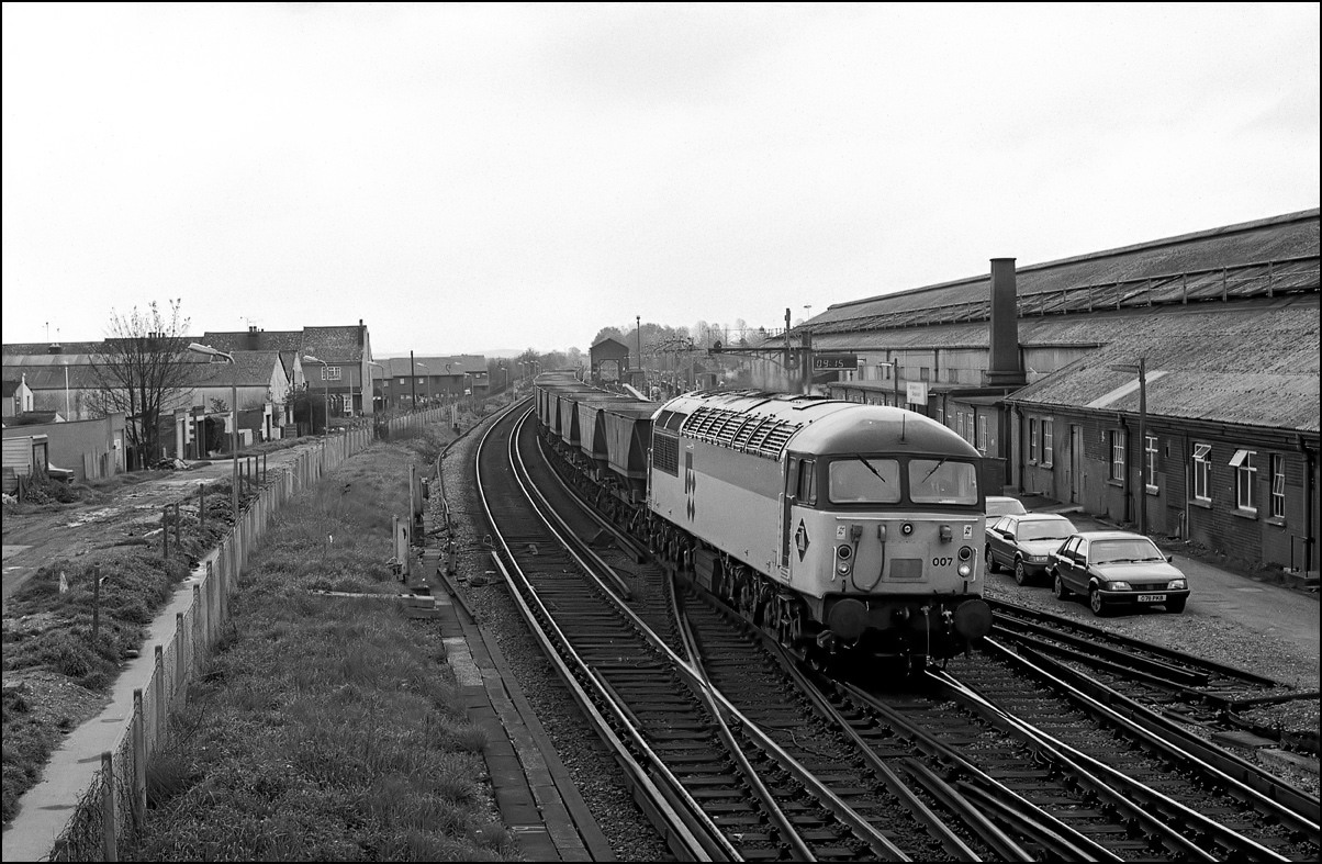 Just after 56007 had passed Gillingam signal box on 3 May 1991 I could hear 33051 with its heavy load of contaminated spoil from Chatham Docks working hard as it came up the gradient towards Gillingham Yard. The procedure here