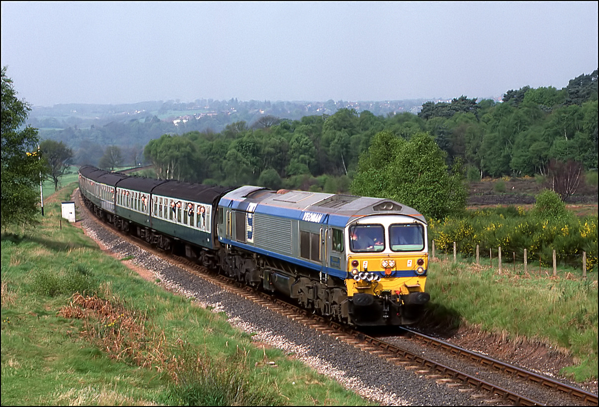 approbation and approval in equal measures. On 6 April 2002 the purple locomotive ran at the head of a railtour from Crewe to York, from where 37521 + 37682 took over for the run to Scarborough.