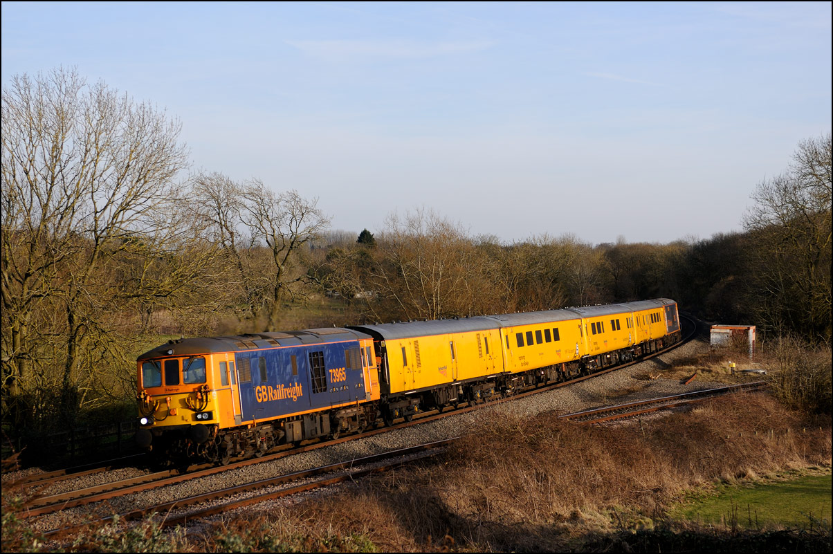 There was a late addition to the Sunday schedules for 26 February 2016 when a 5Z02 from Woking to Derby RTC showed up on Saturday evening. These are usually worth keeping an eye on and this was the case on this occasion when 73965 + 73965 were on the train on top-and-tail mode. Unlike the