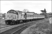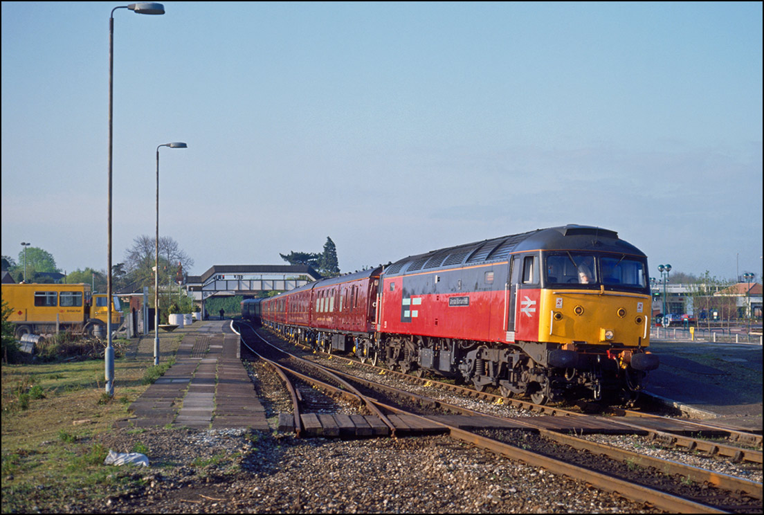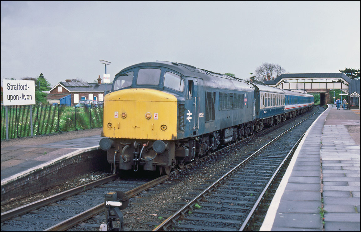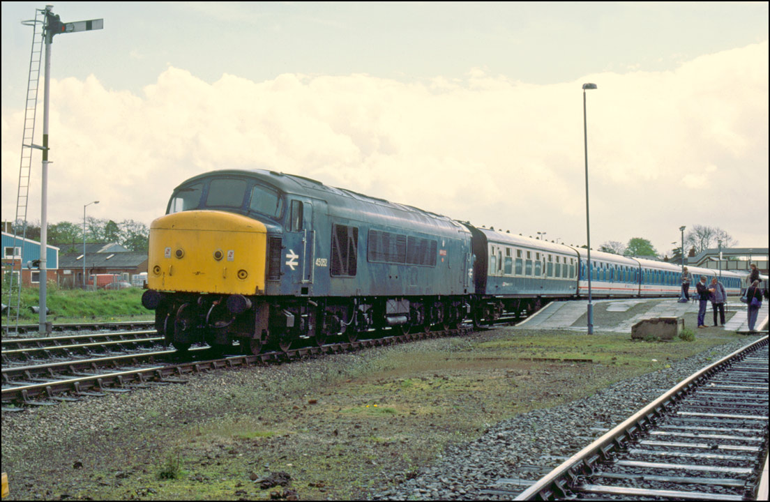 Stratford-upon-Avon has always seen occasional charters and railtours and on 2 May 1988 45052 arrived with The Avon Lady from London St Pancras having run to Birmingham and down the North Warwickshire Line via Henley-in-Arden. The poor weather meant that static shots were going to be the best bet so I took this shot as the train, 1Z37, was waiting for the ground signal to be pulled off so that it could pull out of the station, go beyond the crossover and then be propelled into platform 2 ready for departure. All this was necessary because no loaded passenger trains were at the time allowed to depart from platform 1 because of the facing points into the down goods loop. The situation in 2010 is very different, with trains able to arrive at and depart from any of the three platforms without shunting. |