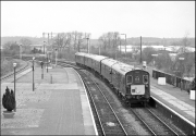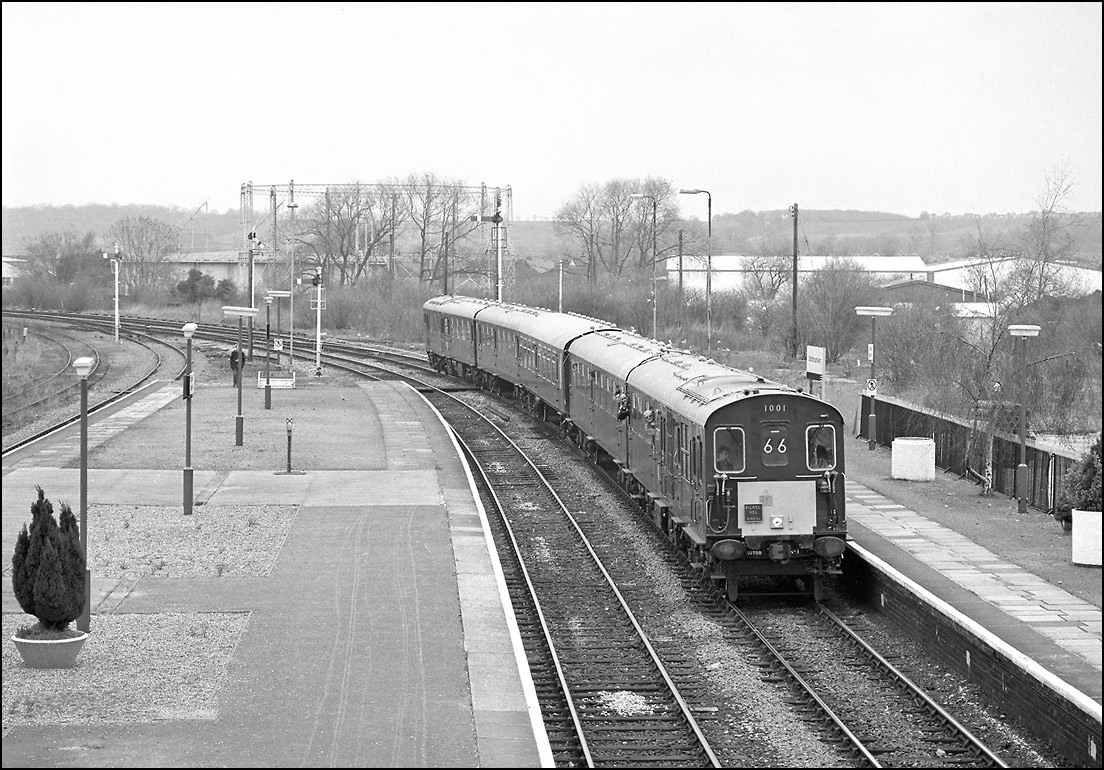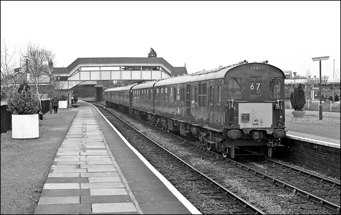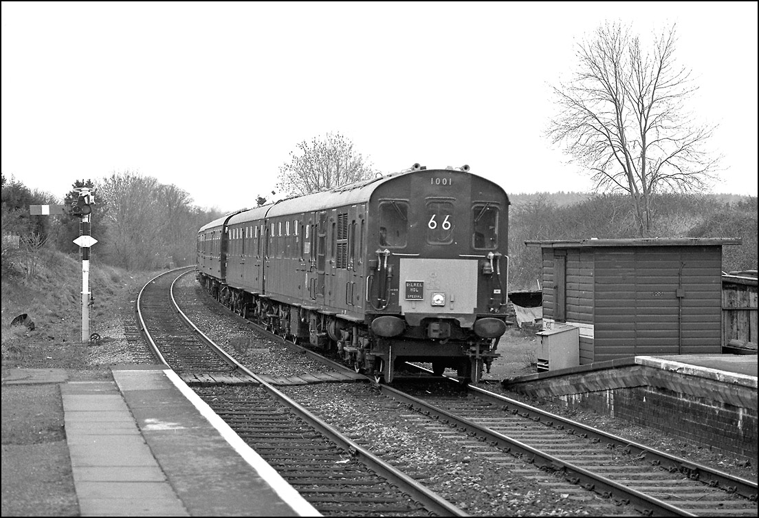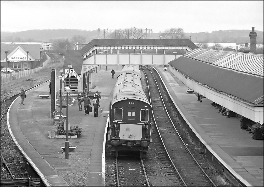 The preserved Hastings DEMU has for over 20 years made regular trips around the country visiting places that members of its class would never have seen when they were in normal service. On 8 March 1997 it ran from Hastings to Stratford-upon-Avon running via Kensington Olympia, Reading, Oxford and Hatton. The weather was, unfortunately, dreadful and I don't recall that I even attempted to take any colour transparencies. If I do find one then I'll try a scan at some point. Here is 1001 running into platform 1 at Stratford with just one other photographer present on the end of the platform. The semaphore signals were only months away from removal and it was good to record this scene with them still present. The DEMU had previously visited the terminus on "Midline Day" in April 1987 when it formed the regular (although infrequent) service to Leamington Spa. |
