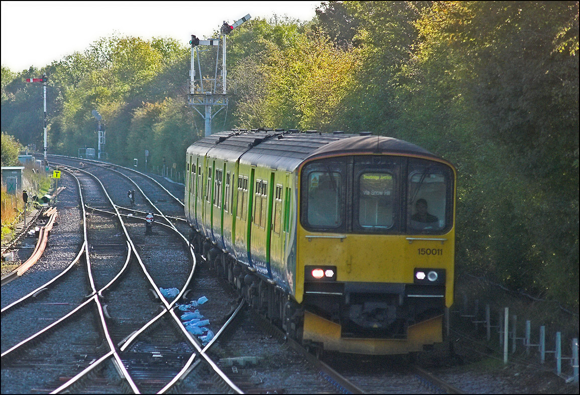 The weekend commencing 24 October 2010 saw the closure of the North Warwickshire Line for the thick end of one week while the semaphore signalling was removed and some track remodelling took place. I have long had a fondness for the line and its infrastructure despite, or perhaps because of, the fact that no locomotive hauled trains are scheduled to run along it. The sole remaining lower quadrant signal between Bearley Junction and Tyseley was to be found just to the north of Henley-in-Arden station and here is a picture of 150011 passing it on Friday 21 October as it slows for the Henley stop with an afternoon train from Stourbridge Junction to Stratford-upon-Avon. The shot I actually wanted would have been taken just before the unit passed the upper quadrant signal visible over the middle coach but the undergrowth was just too obtrusive; much worse than that visible over the front of the class 150. Conventional stepladders wouldn't have been much help as the ground on this public footpath was too soft and uneven for them to be safely used. |