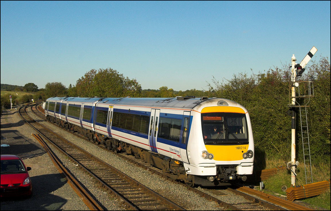 Tuesday 23 October 2007 was a bright and sunny and although I wanted to get out and take some pictures, I couldn't be bothered to travel far. That being the case and with my wife having taken a day off work, we walked along the towing path of the Stratford-upon-Avon to Wilmcote where there is a convenient occupation bridge. The first train to come along was 165001 forming the 10.54 London Marylebone to Stratford. Chiltern Trains' service don't appear to call at Wilmcote station these days, maybe because they run quite close in front of the Central Trains units from Birmingham which means that a quick shunt is required at the terminus for the first arrival and the time gained by not stopping at the station is useful here. |