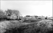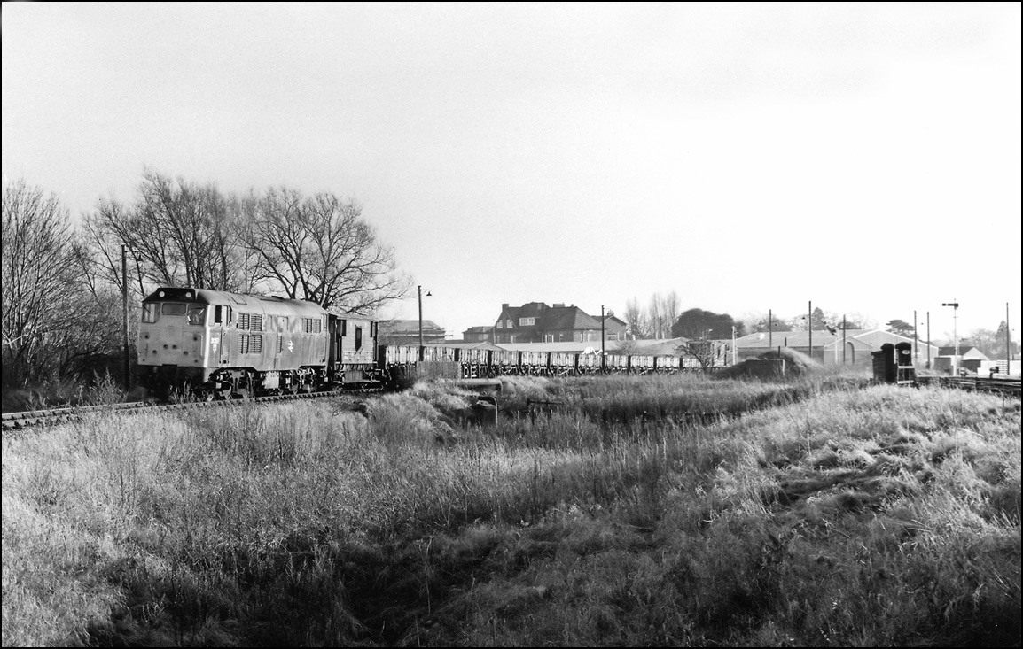 A different sort of English Electric power, not to mention a very different trailing load, is here seen on Sunday 15 May 1993 as 31105 + 31106 haul their spoil train through Wilmcote station. This date was the last of four Sundays of engineering trains on the line and was the only one where any sun appeared. Unfortunately, the sun appeared only at the last moment and I had taken with me only my Mamiya 645 loaded with black & white film. A shame, as I should have quite liked a colour transparency of this scene. |