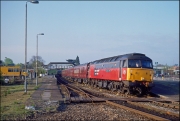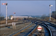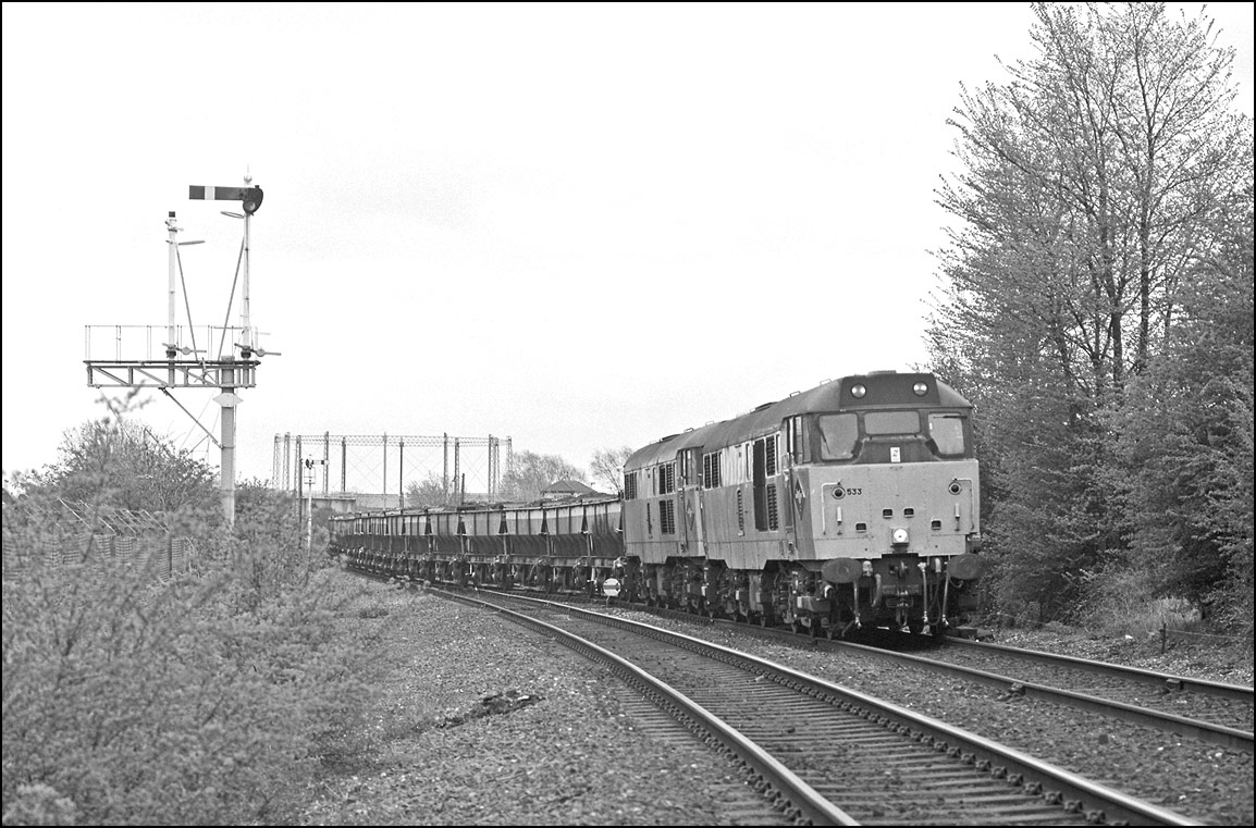 I mentioned in the caption to the photograph above this one that the down goods loop at Stratford-upon-Avon was severed in early 1993. One of the results of this was the removal of another arm from the signal gantry which had originally carried three arms, the smallest of which gave access to the goods yard and which was removed before I started taking photographs. Another engineering train, this time in 18 April 1993 with 31533 + 31186 in charge, is here seen leaving Stratford after having run across the crossover just to this side of the signalbox. In the period between the date of the previous picture and this one, the points mechanism had been greased and serviced to help ensure that nothing untoward would happen. |