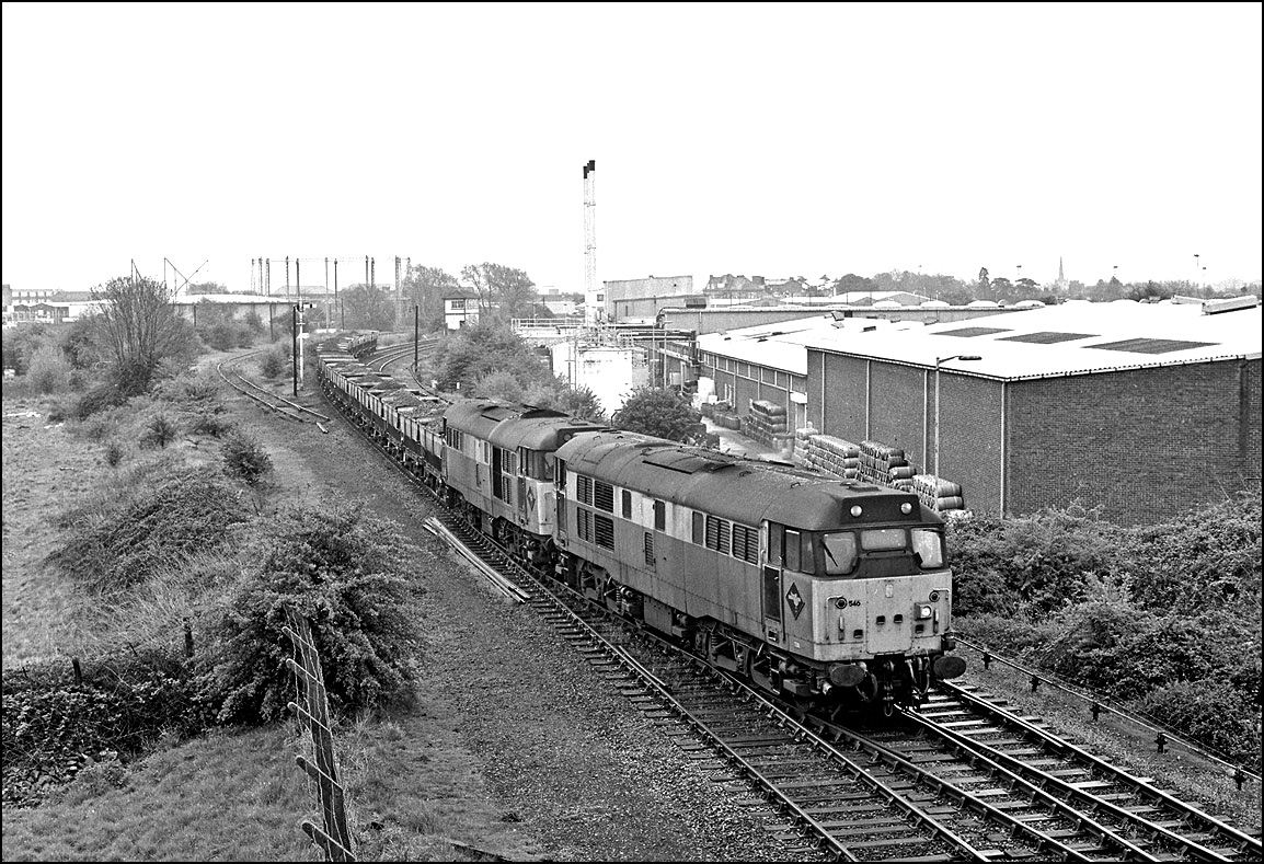 There were four Sundays of engineering work between Stratford-upon-Avon and Wilmcote in early 1993. Most of the work took place on the up line and trains ran to Stratford to allow the locomotives to run round their trains and then head north to the worksite. Pairs of class 31s were used each week and I tried to obtain some photographs in different locations week by week. The train on 25 March 1993 ran to just short of the platforms where the locomotives were detached, ran forward and then backed onto the train via the crossover just to the north side of the signalbox. The signalman wasn't happy about this as he didn't feel that these very rarely used points were up to the job and suggested that I should keep well out of the way in case something went wrong. I felt that this elevated position would be safe enough and in the event 31546 and its unidentified companion safely negotiated the crossover with the spoil train and went off to Bescot. The recently severed connectiion to the down goods loop is clearly visible to the left of the train and it wasn't long before the track was lifted. |