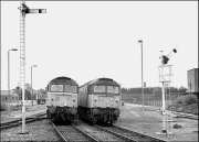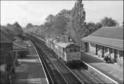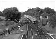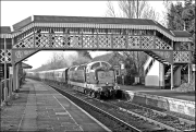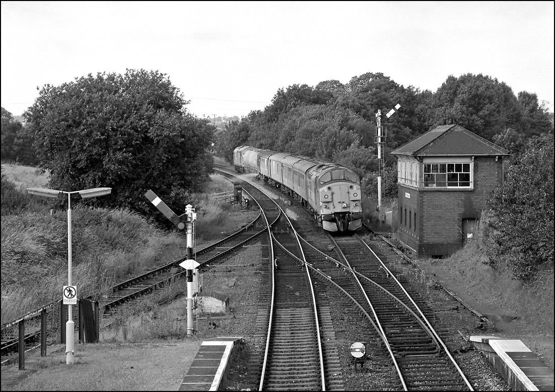 This black & white photograph from 22 July 1998 shows 37114 + 37431 topping and tailing the weedkilling train through Henley-in-Arden. I think that this was the final year in which the line saw locomotive hauled spray trains, MPVs being used thereafter. This working was booked to run to Stratford-upon-Avon for reveral and then to head for Birmingham via Hatton West Junction, Hatton Station for reversal and then across the spur at Hatton between the branch platform and the down main line. I charged over to Hatton after taking this shot and arrived in plenty of time to hear the reversal take place out of sight as the train ran from Hatton West to North Junctions. There wasn't, of course, time for the walk from the road bridge adjacent to Hatton station to the field at North Junction! |