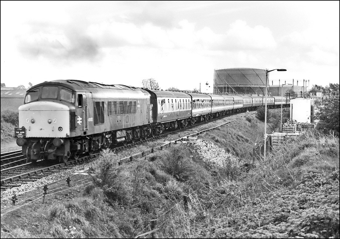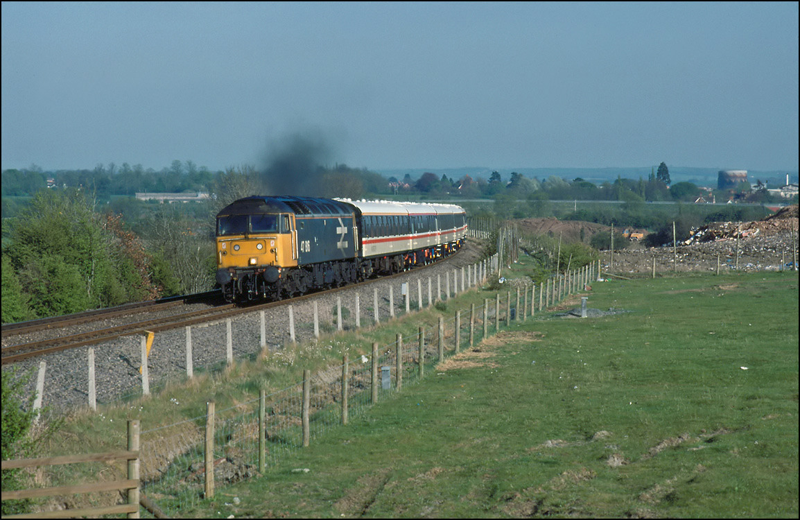 Class 45 locomotives were at one time seen quite often on the North Warwickshire Line while hauling freight trains to and from the South-West and South Wales. Once the line had closed south of Stratford-upon-Avon they became rarer and were restricted to occasional engineers trains and charters. One of the latter 45052, is here seen on 2 May 1988 with the Avon Lady tour from London St Pancras to London Marylebone via Leicester, Nuneaton flyover, Birmingham, Henley-in-Arden, Stratford-upon-Avon (reverse), Hatton, Solihull, Birmingham New Street, Stafford, Rugby, Northampton, Milton Keynes Central, Denbigh Hall South Jn, (via Bletchley flyover), Claydon L&NE Junction, Aylesbury, High Wycombe, Amersham, Harrow-on-the-Hill, and Neasden South Junction. As it was a Bank Holiday Monday, the light was very poor and I could use a shutter speed of just 1/125 second on 100asa slide film. This is the reason for taking the shot by Henley's down outer home signal so early, so as to avoid too much speed blur as 45052 hauled 1Z37 past me at the line speed, 60mph. |