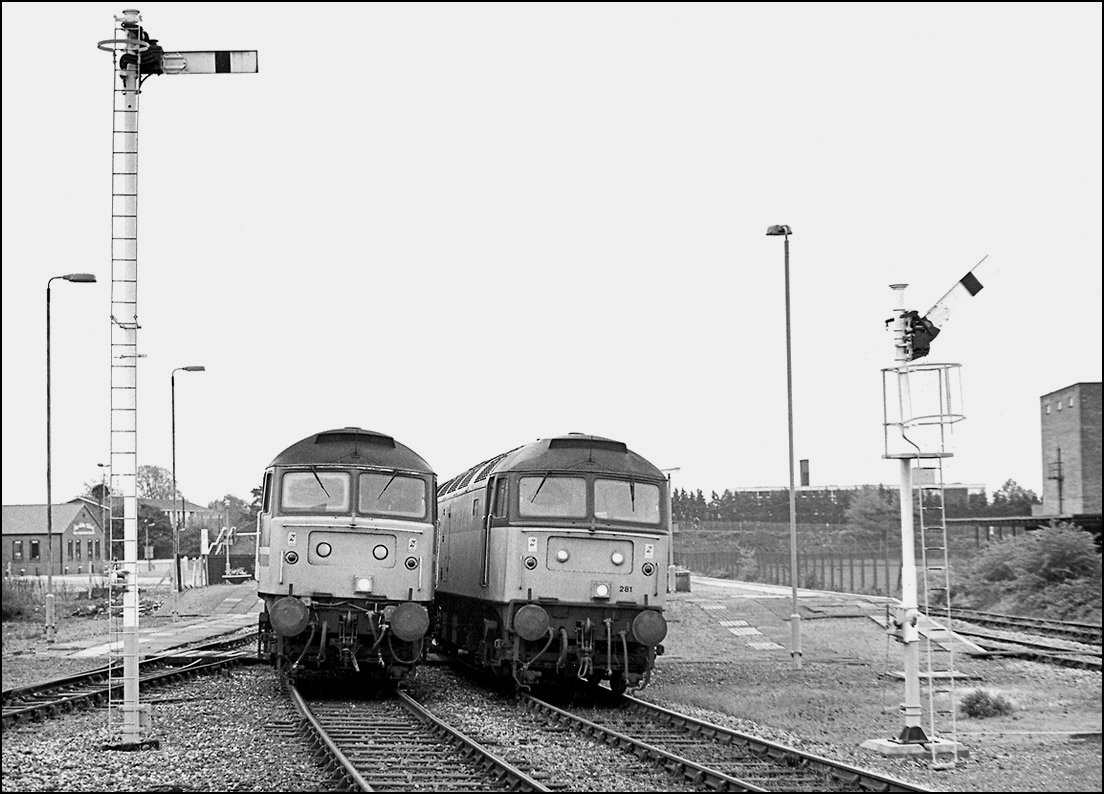 Sometime around 1990 the signalling and point locking arrangements were changed at Stratford-upon-Avon to allow departures from platform 1 to remove the need for trains to shunt after arrival in to either platform 2 or 3 before leaving. Unusually, a new semaphore signal was provided for platform 2 and the tall starter was reallocated to platform 1. On 4 May 1991 a charter from Henley-in-Arden to York was organised, with the stock coming to Stratford in order to run-round. 47805, on the left, was the train engine and 47281 was sent to shunt the stock from platform 1 to platform 2. The latter has just reversed the stock into platform, been uncoupled and is about to return light engine to Birmingham. The train locomotive then shunted onto the stock ready for departure for Henley and York. Ironically, a new locomotive-release crossover had just been installed to the south of the station to simplify things, but the authorities seemed unwilling to sanction its use at this time. |