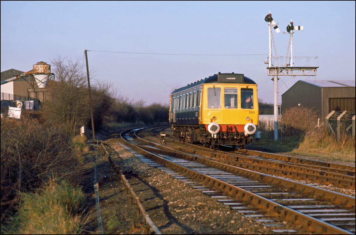 The West Midlands area railway operation was branded "Midline" in the mid-1980s and single unit DMMU 55033 was painted into their house colours. The "bubble car", originally a Western Region train, is here seen passing Stratford-upon-Avon East signalbox on 22 December 1986 forming a late arival from Leamington Spa. The signalman, an ex-locomotive fireman, was obviously in the process of firing his stove at the time. Those iron stoves really kicked out some heat and it's no surprise that the sliding window was open even on such a cold morning. The same unit stayed on the Stratford - Leamington diagram all day and here is a view later in the afternoon as 55033, numbered (T)083, passes the outer home signal. It will be seen from the frost on the sleepers that the temperature didn't rise much above 0 degrees Celsius all day, and I remember being grateful for the warmth and cups of tea I benefitted from in the signalbox between trains. |