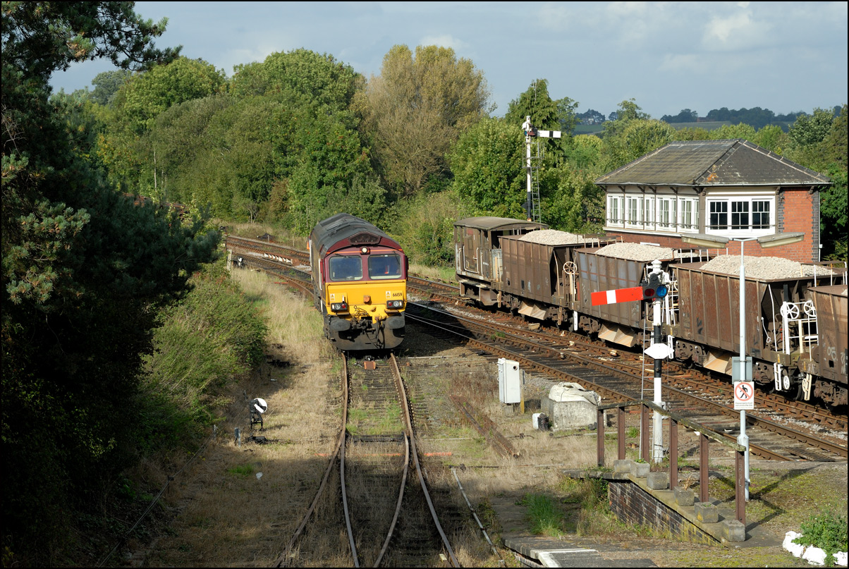 After photographing 60060 just south of Danzey station on 1 November 2008 I carried on to the station to find 66019 standing beyond the platform on a long train of flats loaded with the redundant track panels. The light was becoming worse by the minute and a strong wind was blowing but a couple of shots just had to be taken with the 200mm lens in conjunction with a monopod to minimise camera movement. Here is the train and a road/rail crane in operation along with all the uusual impedimenta of engineering work on the trackside. |