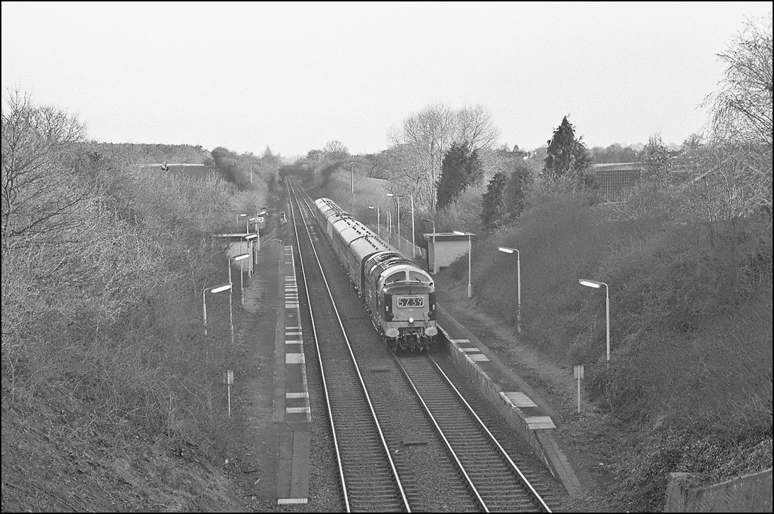 This pictures records the second time that a Deltic locomotive, D9000, ran to Stratford-upon-Avon. It happened on 7 April 2001 when it took a charter from the Warwickshire terminus to York and the outward trip is here seen passing under the GWR bridge at Wilmcote just as 1Z39 tops the 1/75 of Wilmcote Bank. The train was audible for several minutes, probably from the point that the engines were gunned as the locomotive reached the short downhill straight just around the curve from Stratford station. I have a video recording somewhere of the event and it is good to hear the drone getting closer and closer, with a field weakening, almoist like a gear change, taking place right in the platform. I should like this to have been a clour picture but the sun died only a couple of seconds before the shutter was pressed and with a manually operated Olympus OM1 there was no chance to alter the settings to save the exposure. I had earlier struggled to find a location at which to photograph the ECS movement, my favoured spot being out-of-bounds due to the foot and mouth crisis then ongoing. In the end I had to settle for a shot as the train came through Wootton Wawen station; not very inspiring with the sun far too low but certainly unique. |