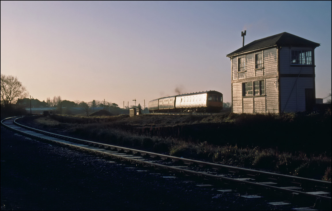 This is the scene from roughly the same spot as the picture above but looking towards the main line. The train is the 08.20 Stratford-upon-Avon to Birmingham Moor Street pictured on the frosty morning of 20 November 1986 with the rising sun giving the usual 3 carriage class DMMU an attractive golden glow. |