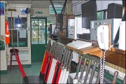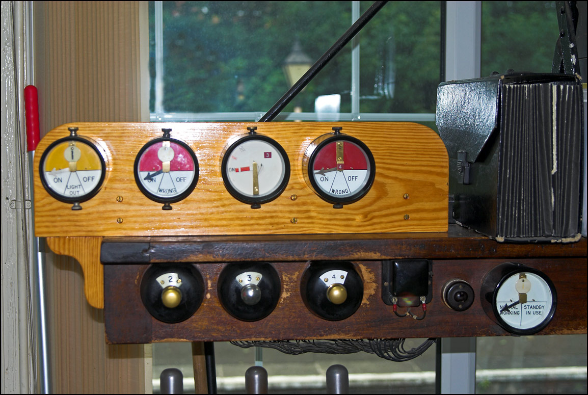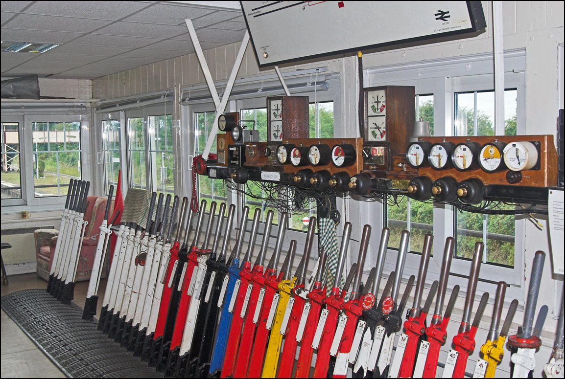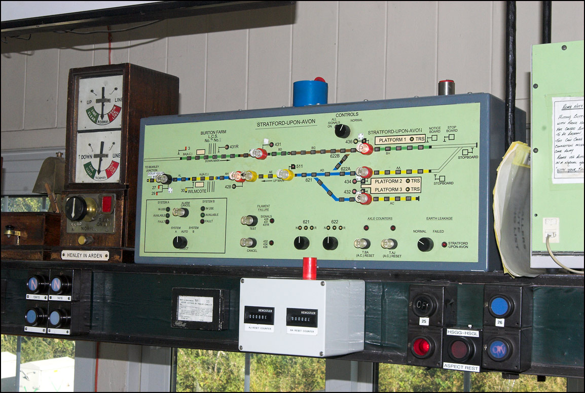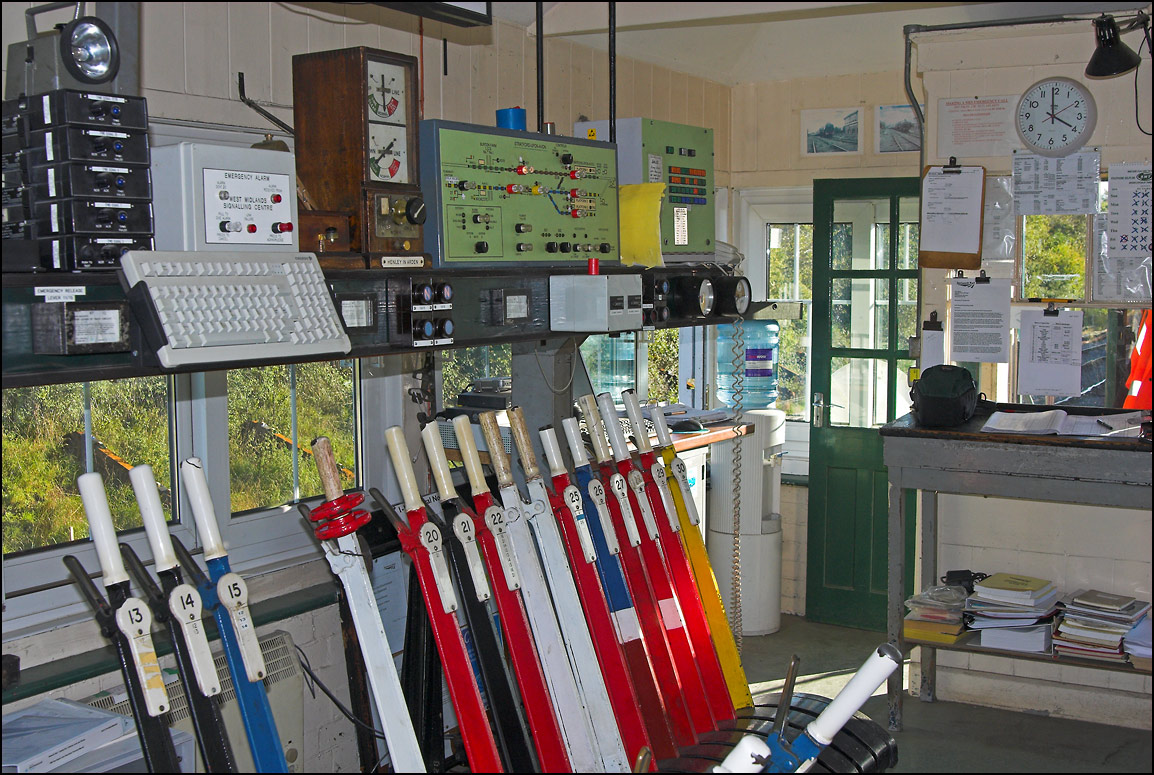 Moving inside the signalbox at Shirley, this is part of the frame and instrument shelf looking towards Stratford-upon-Avon as a blue class 150 DMU heads away on the up line. There is the familiar blend of traditional signalling equipment and the new, including TOPS and TRUST machines and modern emergency equipment. There is also a manual entitled "Water Risk Assessment", the usage of which isn't immediately apparent to me. Perhaps in this Health & Safety obssessed world it is do with the water cooler installed to provide a supply of drinking water for the signaller... |