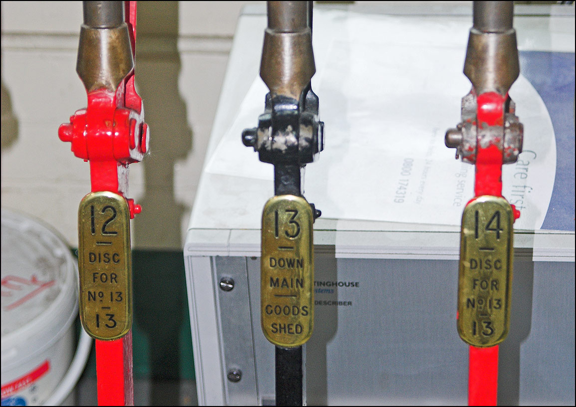 Over the years I have had a couple of visits to the signalbox at Henley-in-Arden and this picture shows part of the frame and the suspended instrument shelf looking towards Stratford-upon-Avon; the down side. The white levers once operated a crossover between the main lines along with the associated locks and ground signals. There was no up loop here, any train required to use the bay platform would have had to have drawn forward beyond the points opposite the signalbox at the other end of the station and then propelled into the siding. There was, however, a connection between the platform line and the other line at either end so that a locomotive could, if necessary, run-round its train. At the date of this photograph none of the recent changes to the track layout had taken place and the lines on the far side of the island platform and their associated signals were still in place and, nominally at least, operational. I say "norminally", because I asked the signaller if he would pull the necessary levers to put one and then the other of the signals controlling the exit to those lines in the "off" position. He had to decline, even though there were no trains due in either direction for at least forty minutes, because he feared that even if the points went across to allow the signals to be moved, then they quite possibly would not have gone back, leaving him with a bit of a problem! |