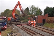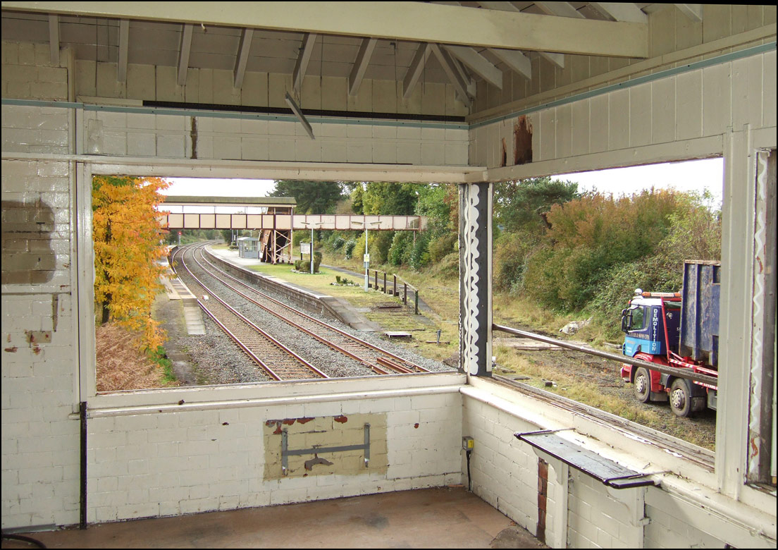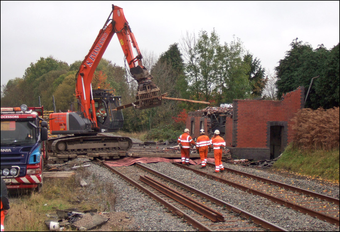 The train standing in the adjacent platform to that headed by 66069 at Stratford-upon-Avon was 6P42, due to depart for Bescot at 11.00. As I haven't had a lot of luck with the engineering trains thus far in the possession I went over to Henley-in-Arden in the hope of photographing 6P42 passing the station, but found that engineers were laying a temporary boarded crossing for use on the following day by the machinery employed to demolish the by now stripped signalbox which, on the previous day, was having the last panes of glass knocked out of the frames. Note that several signal levers are just visible in the grass alongside the track. It seemed unlikely that a train would be allowed over the line while this sort of activity was in progress so I headed back towards Stratford to see what was going on there. |