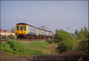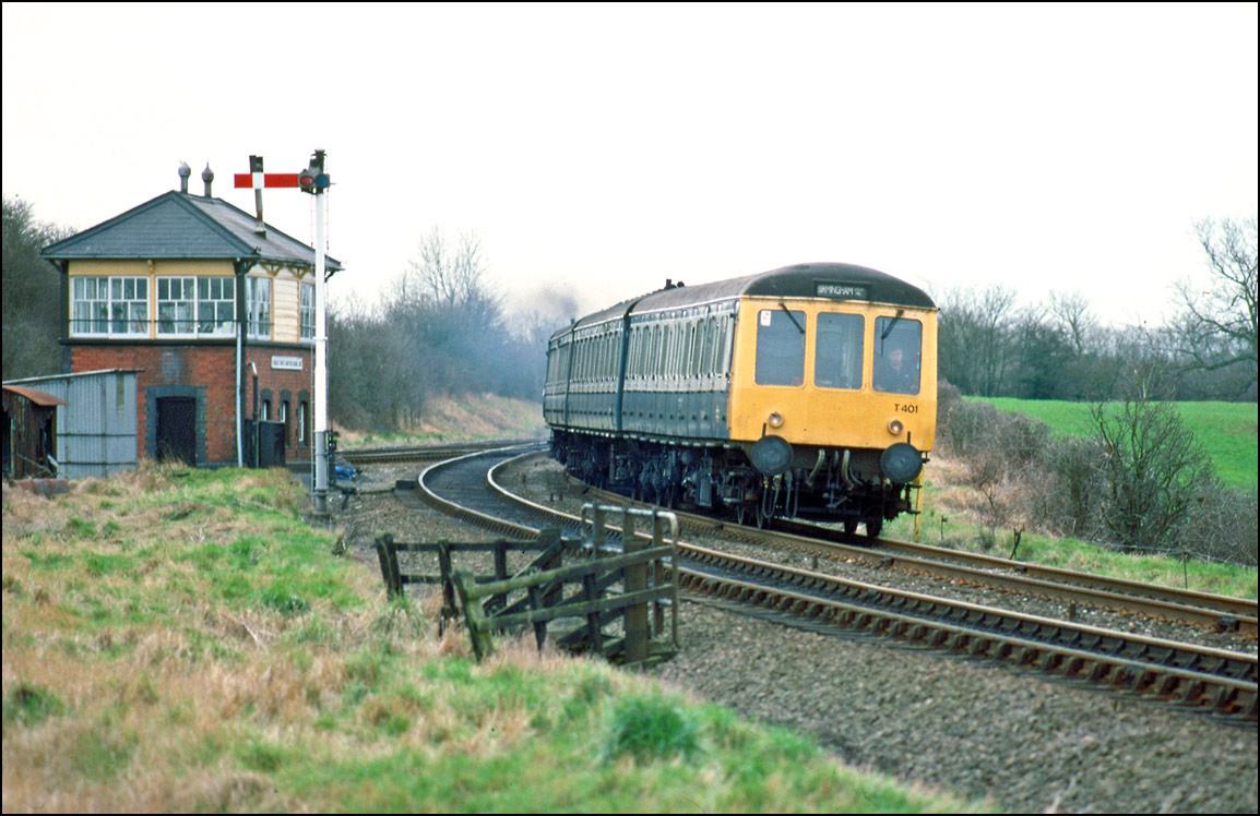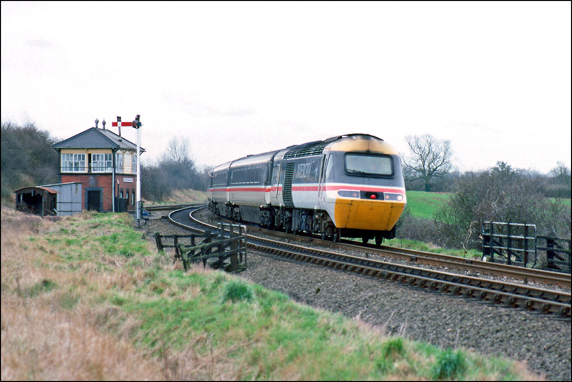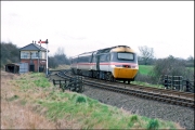 Over the years, the North Warwickshire Line has seen its share of rare and unusual workings, but to the best of my knowledge, only one High Speed Train (Intercity 125) has travelled the full length. This happened on Saturday 11 March 1989 when Red Nose Day was marked by the running of The Bakers Dozen by Hertfordshire Railtours from London St Pancras to London Liverpool Street via Stratford-upon-Avon, Birmingham, Norwich and Yarmouth. HSTs have used the branch from Bearley to Hatton on many occasions, including a daily scheduled service to and from Stratford to London Paddington in the summer of 1991. For those interested in the tour, the power cars were 4305 + 43092 complete with a Comic Relief nose on the grille of each. The train is here seen in shocking weather as it passed Bearley Junction signalbox while en-route from Stratford to Birmingham photographed from a rather soggy field. The more usual form of train to be seen here is represented by this four car DMU running about 20 minutes ahead of the HST. |