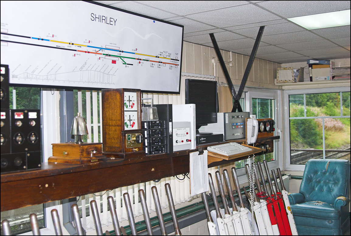 This is the view inside Shirley signalbox looking towards Birmingham showing the illuminated track diagram and the traditonal signallers' armchair. To the right of the window used to be the goods yard and although teh yard is long gone, the point and signal levers controlling access to the little-used siding still recall those days. Some of the dials connected with the up line signals situated on the down side of the 'box can be seen here. |