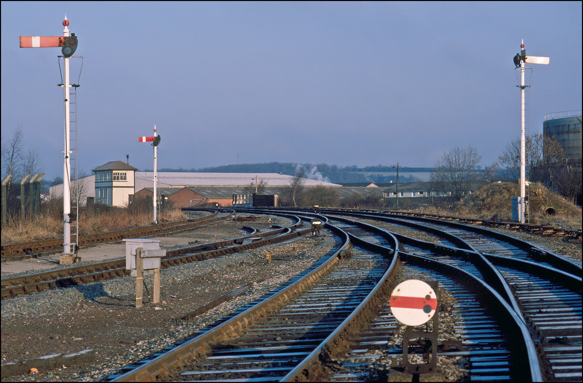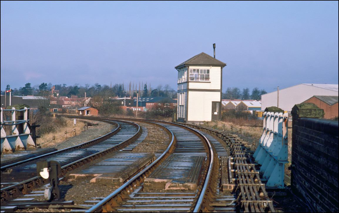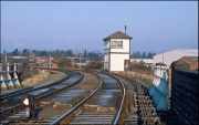 This and the following two pictures were taken on Sunday 11 January 1986 when I took advantage of the fact that there were no trains to Stratford-upon-Avon on winter Sundays. It shows the scene looking north from the station including the ground signal used by trains shunting from platform 1 into platform 3, the starter for platform 2 and the starter for what was locally called the "cold store siding"; the line adjacent to the platform 3 road. Stratford-upon-Avon East signalbox is also clearly visible just around the curve beyond the bridge taking the lines over the Stratford canal. On the right is the inner home signal and just beyond that the World War II air raid shelter made from a large diameter concrete pipe buried under a few feet of soil. The engine shed was adjacent to the goods loop which passed to the far side of the shelter so the shelter was handy for the men working there, but less so for the station staff. Incidentally, the top of the shelter was a useful photographic vantage point for anything leaving the station in the morning as witnessed by this 1984 picture of 45020 on a Henley-in-Arden to York charter sent here to run-round. |