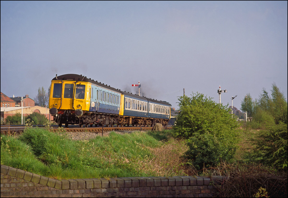 I always had a soft spot for the single unit "bubble cars" used for many years on the Stratford-upon-Avon to Leamington Spa trains. In the later years of its life, 50033 was repainted from the standard blue and grey into a livery based on the house colours of Midline, the marketing name for the Western MIdlands PTA. This picture shows the unit together with a class 114 two car set leaving Stratford with the 18.30 to Birmingham on 2 May 1994. The photograph was taken from the towing path of the local canal at a time when the vegetation had not encroached too much and the semaphore signalling was still in use. The train left from platform 1 which was controlled by the tall upper quadrant starter showing a clear aspect. Neither the single unit or the class 114 were to be seen here for much longer as their replacement, in the form of class 150 sprinters were coming into service. 645 |