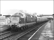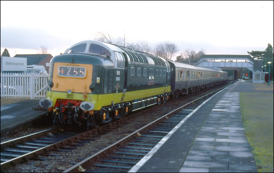 A more recent rare visitor to Stratford-upon-Avon is seen here. D9000, Royal Scots Grey came to the town on the early morning of 9 December 2000 with a railtour from Shirley, on the North Warwickshire Line, to the Lindum Fayre at Lincoln. When I was a young enthusiast in the 1960s, I would no more have dreamed of a seeing a Deltic here than Sir Nigel Gresley or Mallard, both of which appeared here in the 1980s. In fact, there are now very few classes of locomotive, steam or diesel, not to have visited the town. The train, reporting number 1Z55, is here seen at 08.15, just before departure to Lincoln via Hatton West to North Junctions and thence Birmingham, Water Orton, Hinckley, Leicester and Nottingham. I did also take a colour transparency of D9000 but the lighting was a little difficult with the sun rising and illuminating the other side of the train. After returning from Lincoln, the train departed from Stratford shortly before 10pm and I did stand outside my house, about a 5 minute walk from the station, to hear it roar away up Wilmcote Bank and back to Birmingham. |