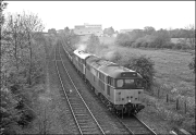 This photograph was taken from the first overbridge on the line out of Stratford-upon-Avon and shows 31186 + 31533 trying to gain speed with their spoil train before hitting the 1/75 of Wilmcote Bank. My notes aren't up to much at the best of times and I don't seem to have written down the date of this picture but it was probably about the 25 April 1993. A new bridge was built here to accompany a new road and the high parapet, linked with unchecked growth of lineside vegetation has just about done away with this shot. |