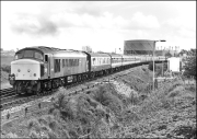 After visiting Stratford-upon-Avon the train returned north via Bearley Junction, where it is pictured below with some happy-looking bashers visible, on the single line to Claverdon and Hatton North Curve - more very rare line for loco haulage. This shot was not really worthwhile for some years before the signalbox was demolished because a lot of trackside infrastructure such as a communication mast and various relay boxes were built here when Bearley Junction 'box took over responsibility for signalling at Stratford-upon-Avon when the 'box there was removed. The lower quadrant signals just about visible in the right background, the smaller arm of which controlled access to the single track to Hatton. These signals were converted to examples operating in the upper quadrant some time after the date of this photograph. |