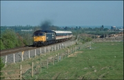 A locomotive-hauled train to my home town of Stratford-upon-Avon is always something to which I look forward and none more so than the Green Express charter from Holyhead on Saturday 14 April 2007. This was booked for class 47s 47851 and 47854 running in top and tail mode to ease the problems with shunting and, unusually, ran via the North Warwickshire line, a line not noted for seeing locomotives of any description. 1Z22 was running about 30 minutes late due to problems in the Penkridge area resulting in a diversion across the Cannock Chase line through Hednesford. 47851 is here seen about to pass under the Edstone Aquaduct near Bearley, the longest cast-iron aquaduct in England. The early morning haze has pretty well burned off, but with just a slight mist in the distance which, to my eyes, enhances the scene. The North warwickshire line has some attractive but completely anonymous locations and some complete with a signal box and semaphores that are of little use until the sun is further round later in the day. |