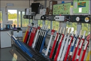 During my visit to Bearley Junction signalbox I was asked to take some photographs recording the interior. This is the frame at the down (Stratford-upon-Avon) end showing the mix of traditional and modern equipment. The mechanical frame is from the Midland Railway replacing the original GWR version but the block instruments are the originals and are connected to Henley-in-Arden 'box unless it happens to be switched out, at which time the block extended to Shirley in the West Midlands. This long section generally applied only on Sundays and odd occasions when a relief signaller was not available to help out the regulars. The green-faced panel in the centre of the picture controlled the points and signals at Stratford and came into existence when the 'box there was abolished. Here is a closer view of the panel showing a bit more detail. |