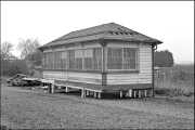 I mentioned above that the signalling at Stratford-upon-Avon was, by September 1998, controlled from Bearley Junction using electrically operated colour light signals. This is my final shot of Stratford-upon-Avon East Signalbox, or at least part of it, after removal from the base and apparently heading for preservation. I had hoped to obtain a mmomento from the signalbox, in the form of a redundant track diagram which had been removed some time before and shoved behind a cupboard but when the regular signalman went to retrieve it for me, someone had beaten him to it. |